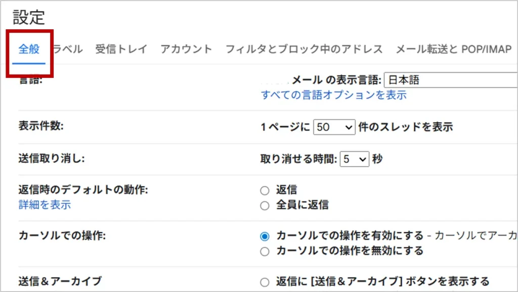 設定画面が開きます。デフォルトで「全般」タブが選択されていることを確認してください。
