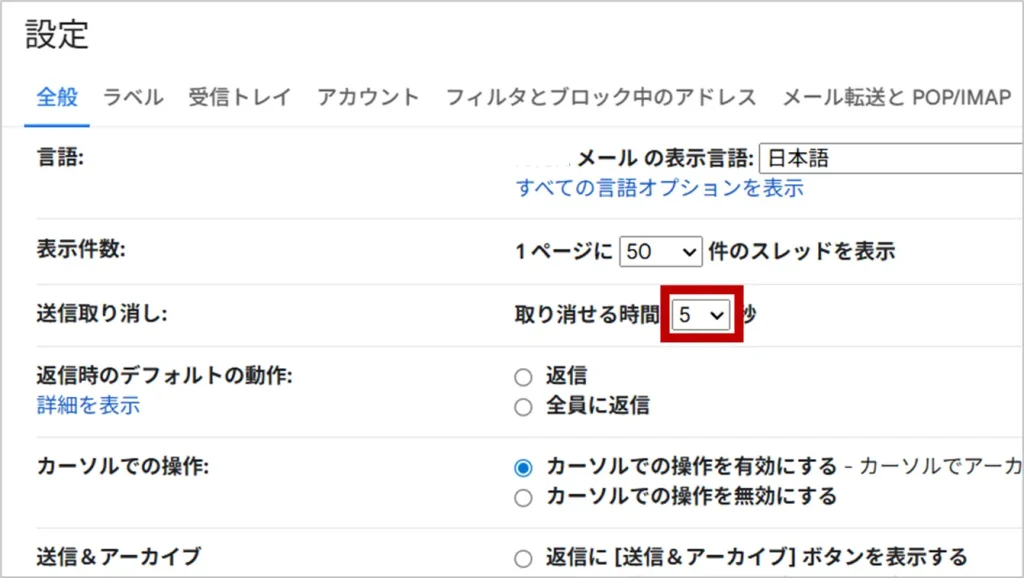 Gmailのデフォルト設定では、送信取り消し時間は「5秒」になっています。