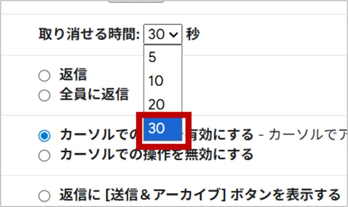 まだ設定を変更していない方は、今すぐGmailの設定画面を開き、送信取り消し時間を「30秒」に変更してください。