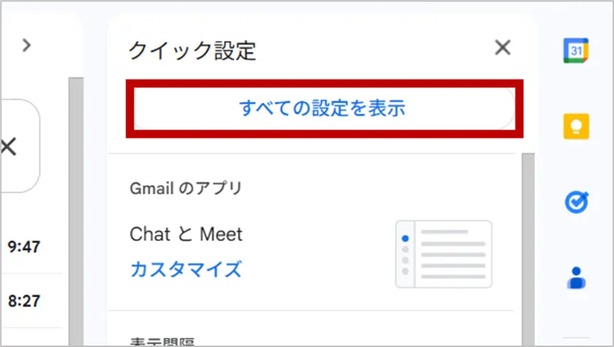 クイック設定メニューが開くので、その上部にある「すべての設定を表示」ボタンをクリックします。