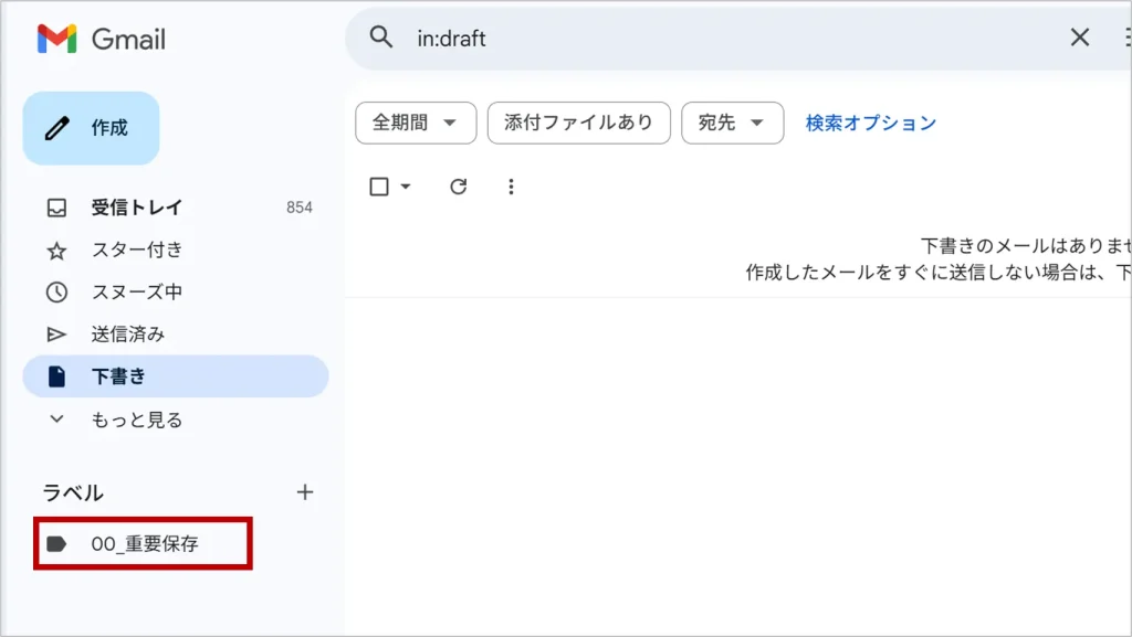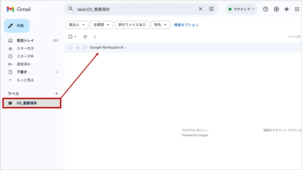 label:削除したラベル名は使えなくなるので、キーワード検索になります)を入力してメールを探す。 - 該当するメールを選択し、新しく作ったラベルを貼り直す。