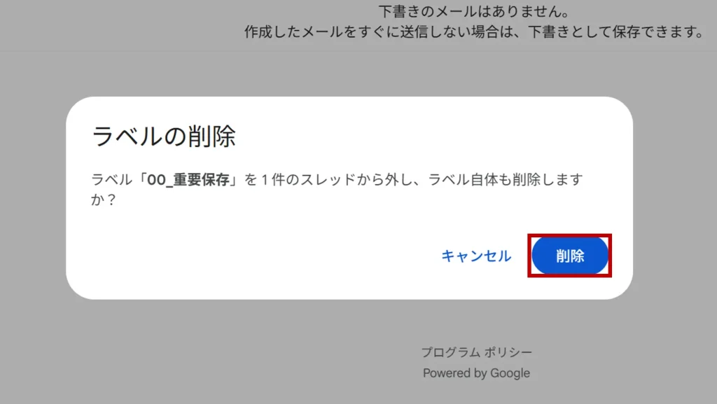 「ラベルを削除しますか?」という確認ポップアップが出ます。「このラベルから ○○ 件の会話が削除されるわけではありません」と表示されているのを確認し、「削除」ボタンを押します。