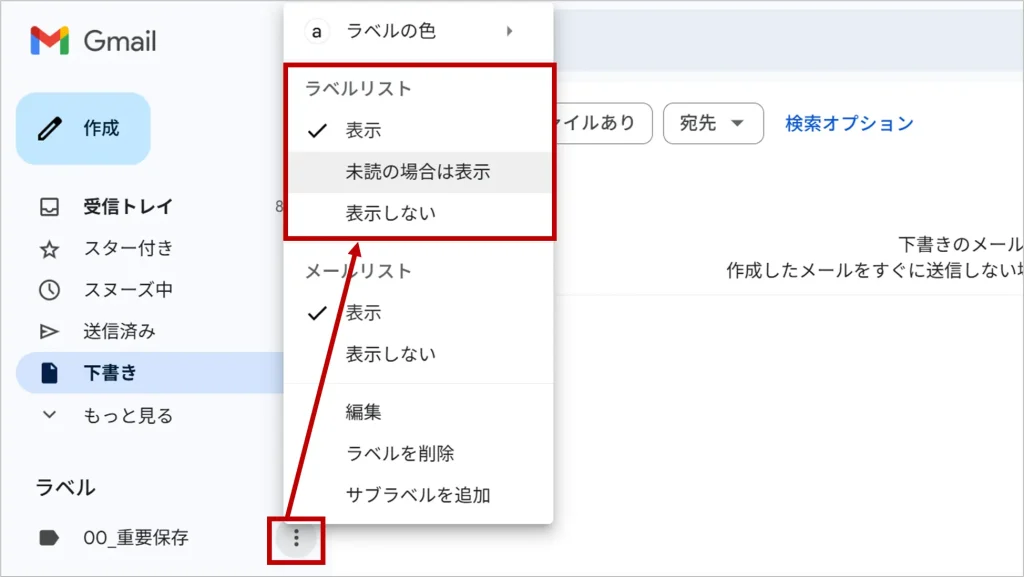PC版の設定画面(ラベルタブ)を開くと、各ラベルの横に「ラベルリストに表示」という項目があり、「表示 / 未読の場合は表示 / 非表示 」を選択できます。