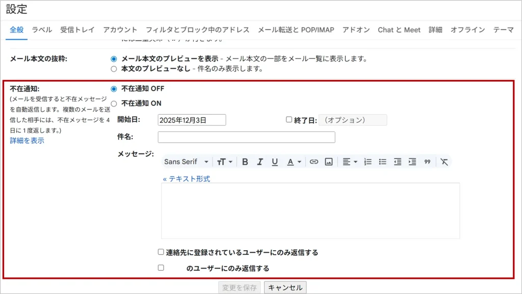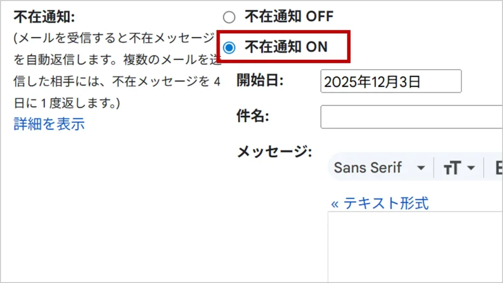 Gmailの不在通知は「日付単位」での設定しかできず、「時間指定」や「曜日指定」の繰り返し設定はできません。