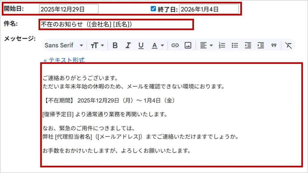 期間中はメールの確認が遅れます。 急ぎの案件は [代理者] 宛、もしくはSlackにてメンションをお願いします。 [復帰日] に戻ります。