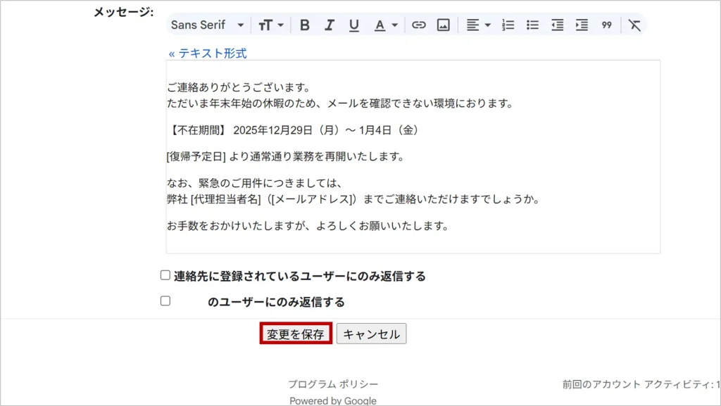 ご紹介したテンプレートをコピーして、さっそく設定してみてください。それでは、良い休暇を!