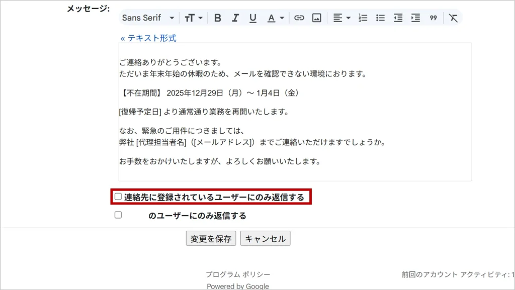 営業時間外の自動返信を行いたい場合は、Google Workspaceの有償アドオンや、GAS(Google Apps Script)などの高度な設定が必要になります。