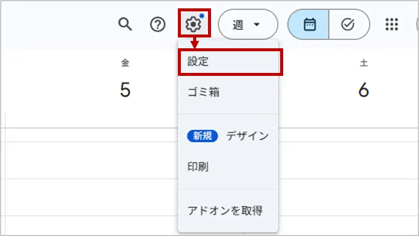 PCでGoogleカレンダーを開きます。 画面右上にある「歯車アイコン」をクリックし、「設定」を選択します。