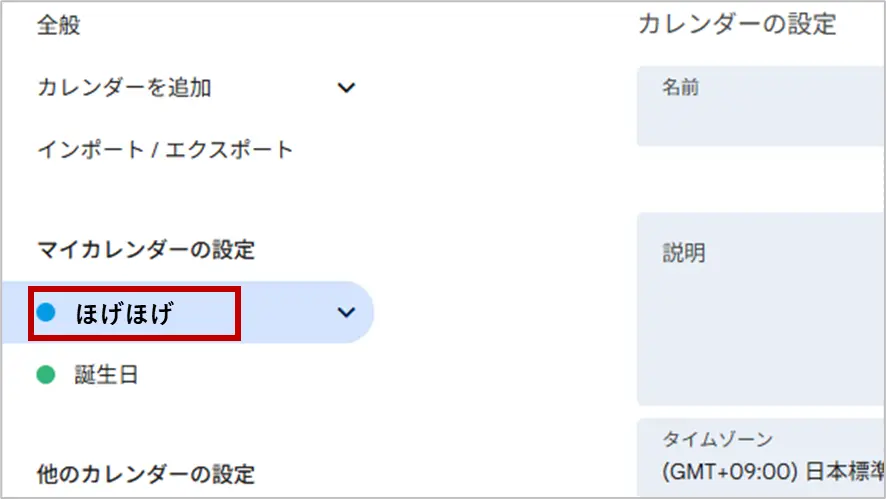 画面左側のメニューに「マイカレンダーの設定」という項目があります。 ここにある自分の名前(または共有したいカレンダー名)をクリックします。