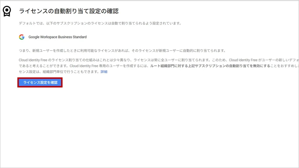 ライセンスの自動割り当てが設定されている場合は「ライセンスの自動割り当て設定の確認」の画面が表示されます。