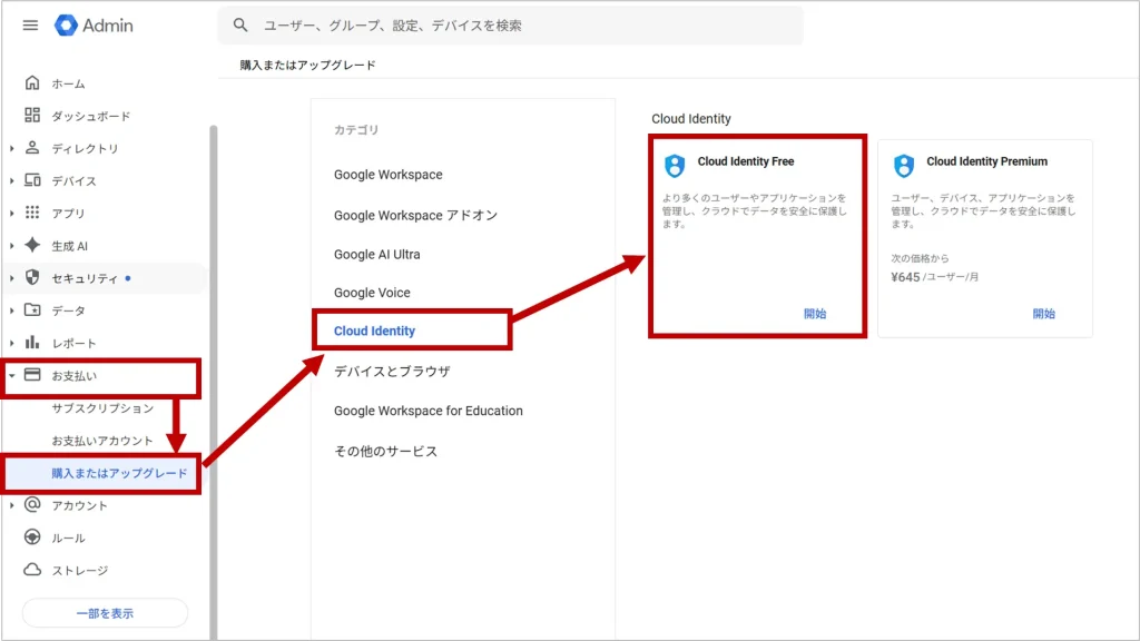 左側メニューから [お支払い] > [購入またはアップグレード]> [Cloud Identity]>[Cloud Identity Free]を確認します。