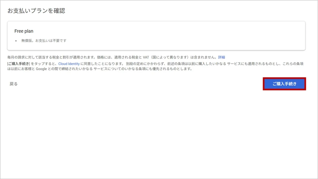 購入画面に進みますが、「Free Plan」 になっていることを確認して、[ご購入手続き]をクリックします。