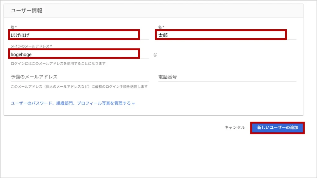 氏名、メールアドレスを入力し、[新しいユーザーの追加] を実行します。