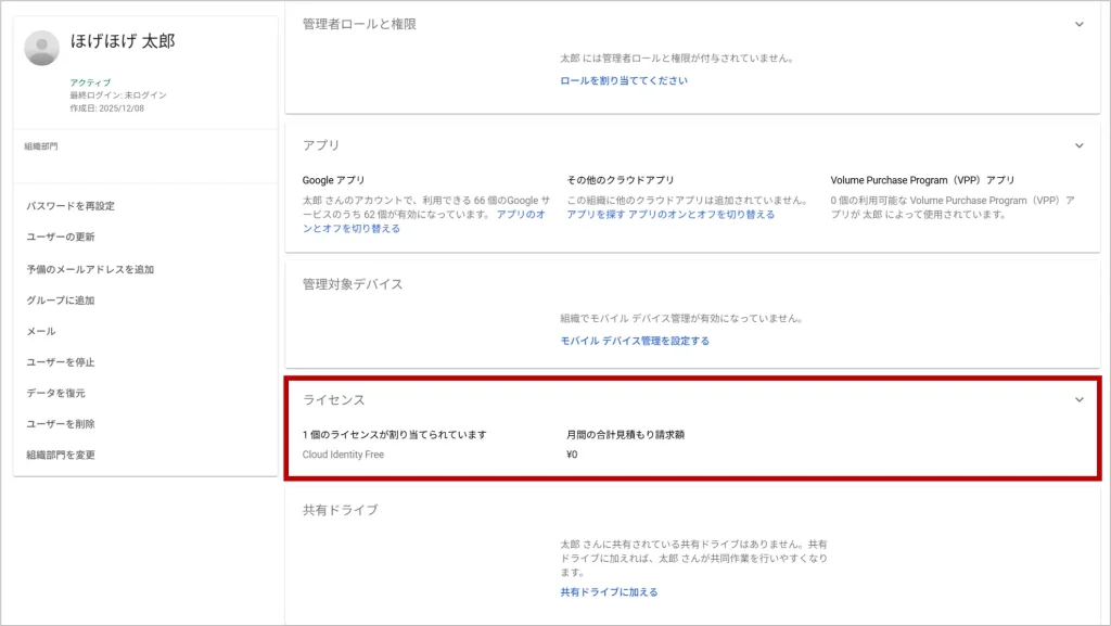 ユーザー詳細画面で「Cloud Identity Free」のみ割り当てられていることを確認します。