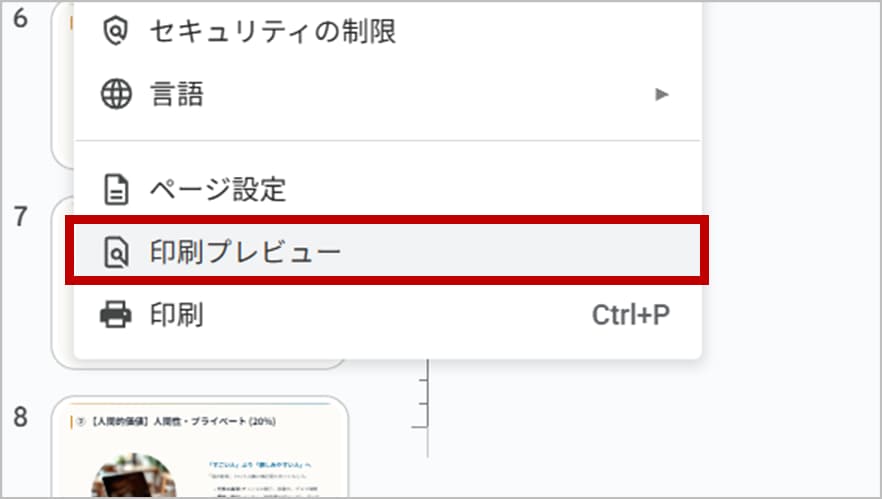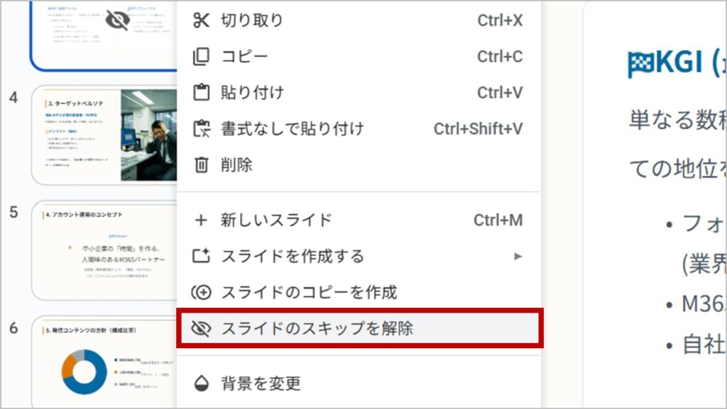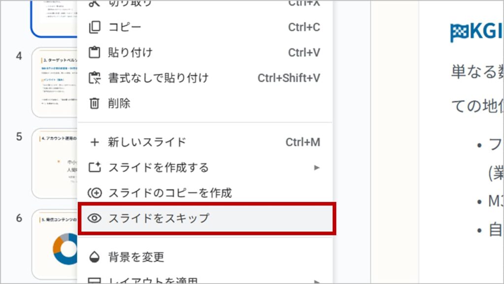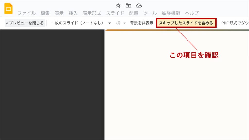 Googleスライドの機能名としては「スライドをスキップ」という名称になっていますが、これが一般的に言う「非表示」と同じ役割を果たします。