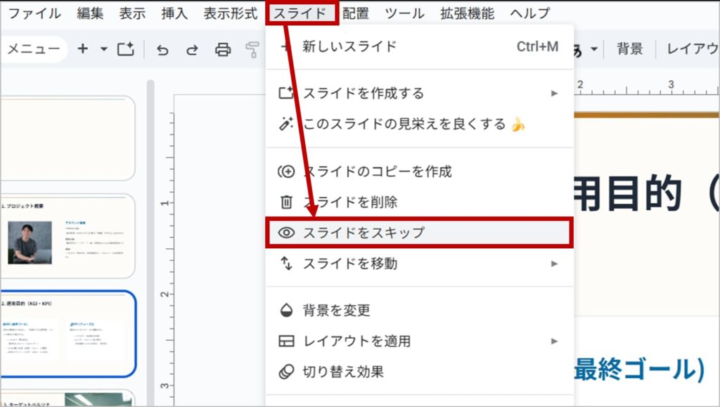 【結論】Googleスライドでは「スライドをスキップ」という機能を使います。