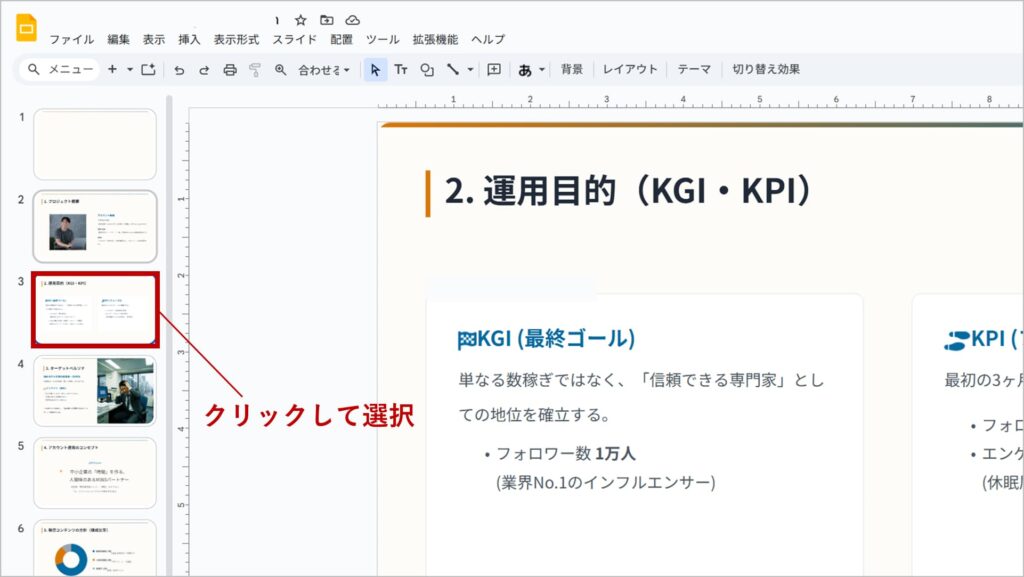 左側のスライド一覧から、非表示にしたいスライドを選択します。